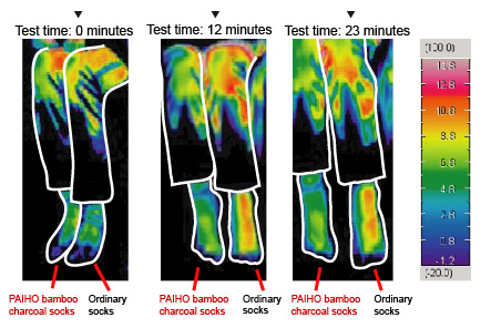 Note: Higher temperature means that the socks’ heat loss rate is higher and warmth-retaining property is poor. Test results found that the ordinary socks were emitting (body) heat all the time but that Lacoya’s bamboo charcoal socks could effectively retain heat even when the temperature dropped.