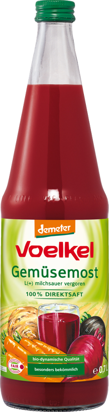 Only raw materials in Demeter quality are used for this lacto fermented L (+) vegetable juice. The naturally aromatic red beet tubers, the aromatic carrots and the tasty celery are pressed gently and in a value-preserving way before we mix them with valuable lactic acid bacteria; and we completely do without the addition of salt.